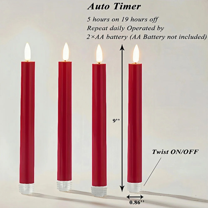 Simplelight Red Flameless Taper Candles with Timer - Battery Operated Candles, LED Candlesticks, LED Taper Candle Battery Operated Set of 4 H:9 Inch (Red)